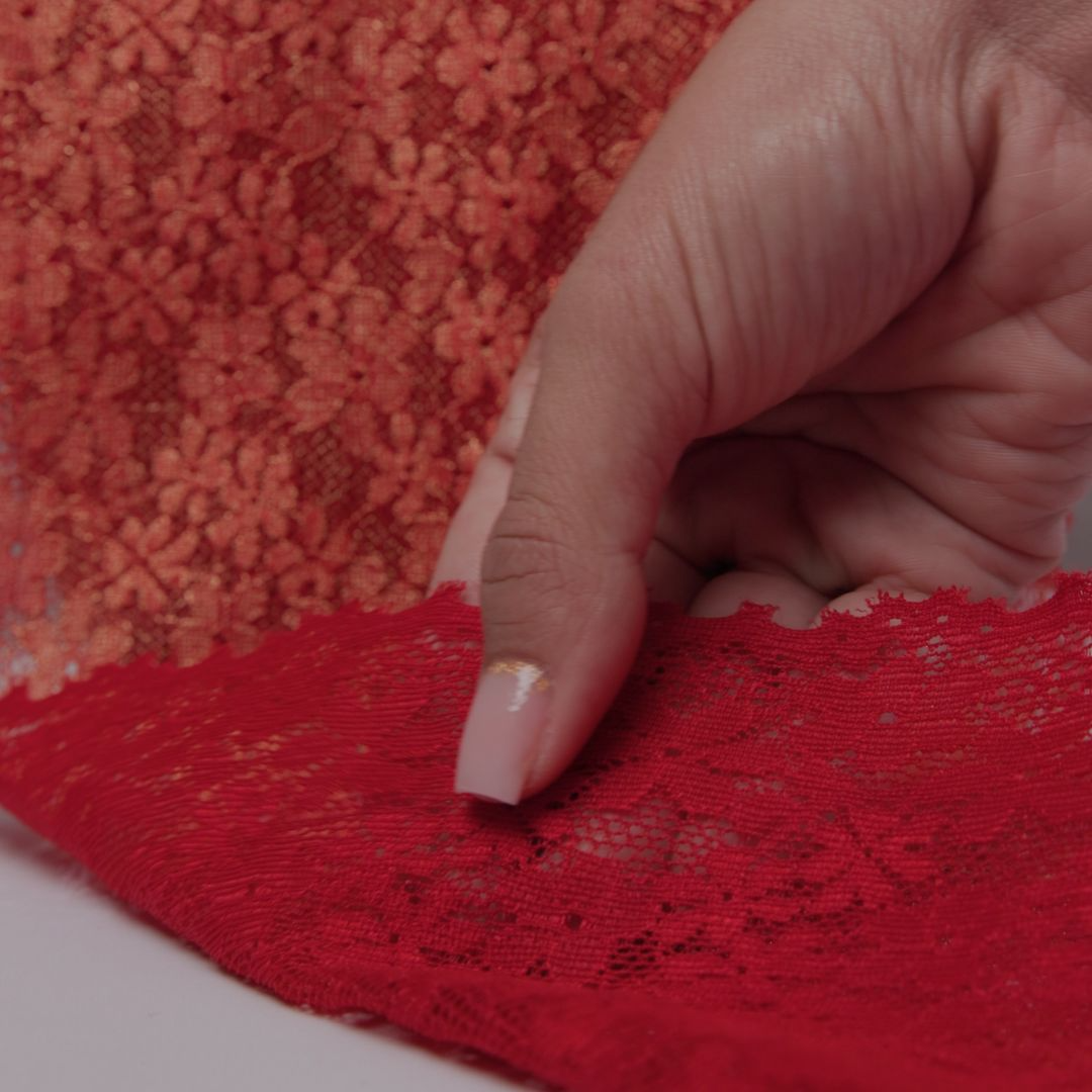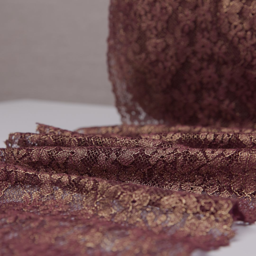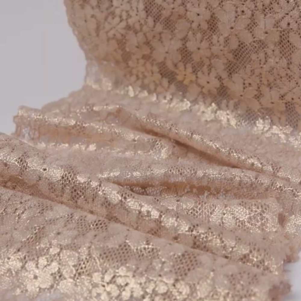 Renda Lurex para lingerie com brilho sutil, toque macio e excelente elasticidade. Ideal para quem busca acabamento sofisticado, conforto e maior valor percebido nas peças, com venda por metro para mais controle na produção.